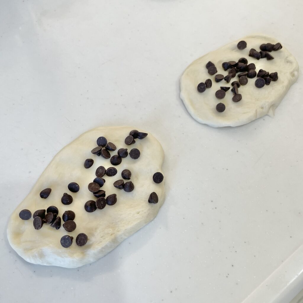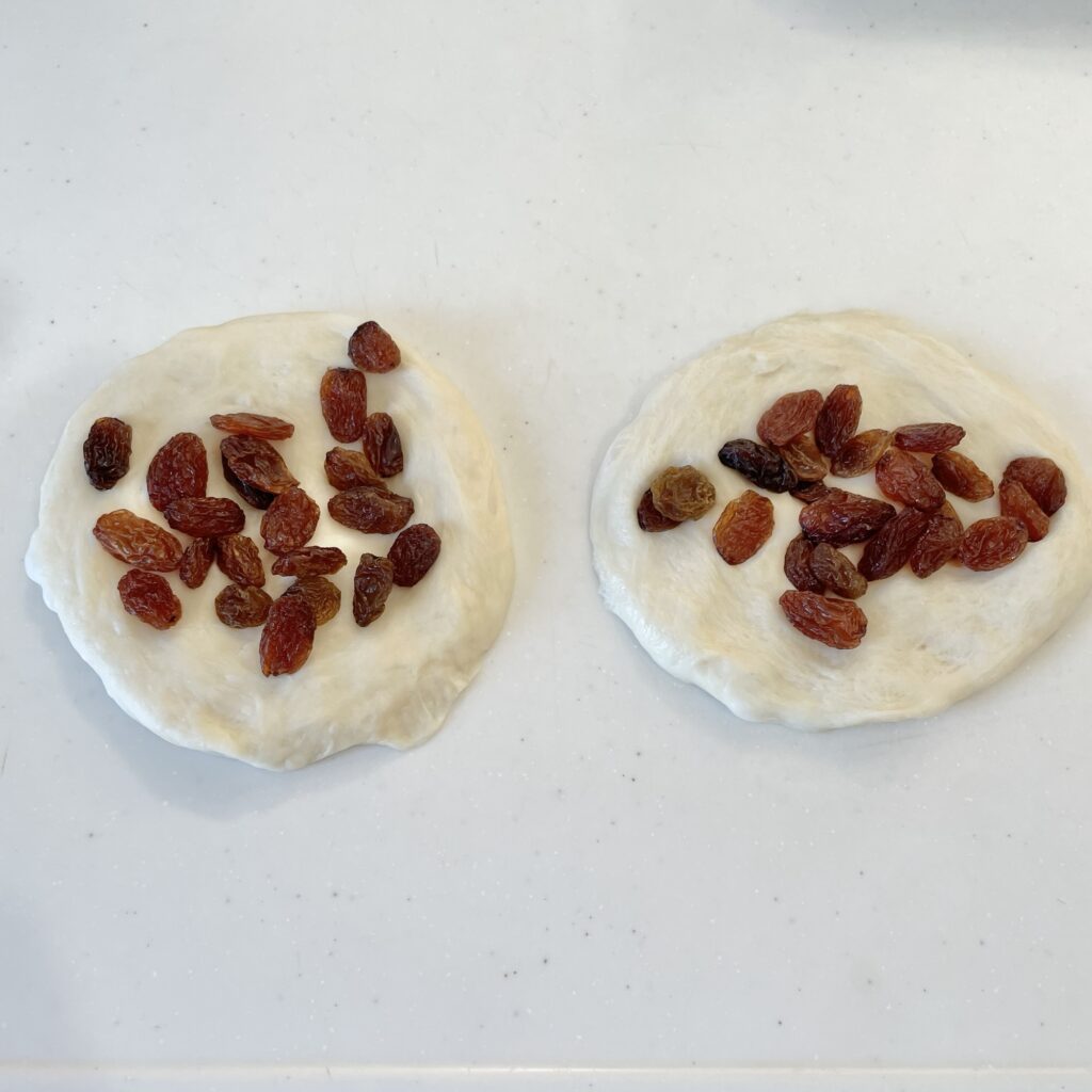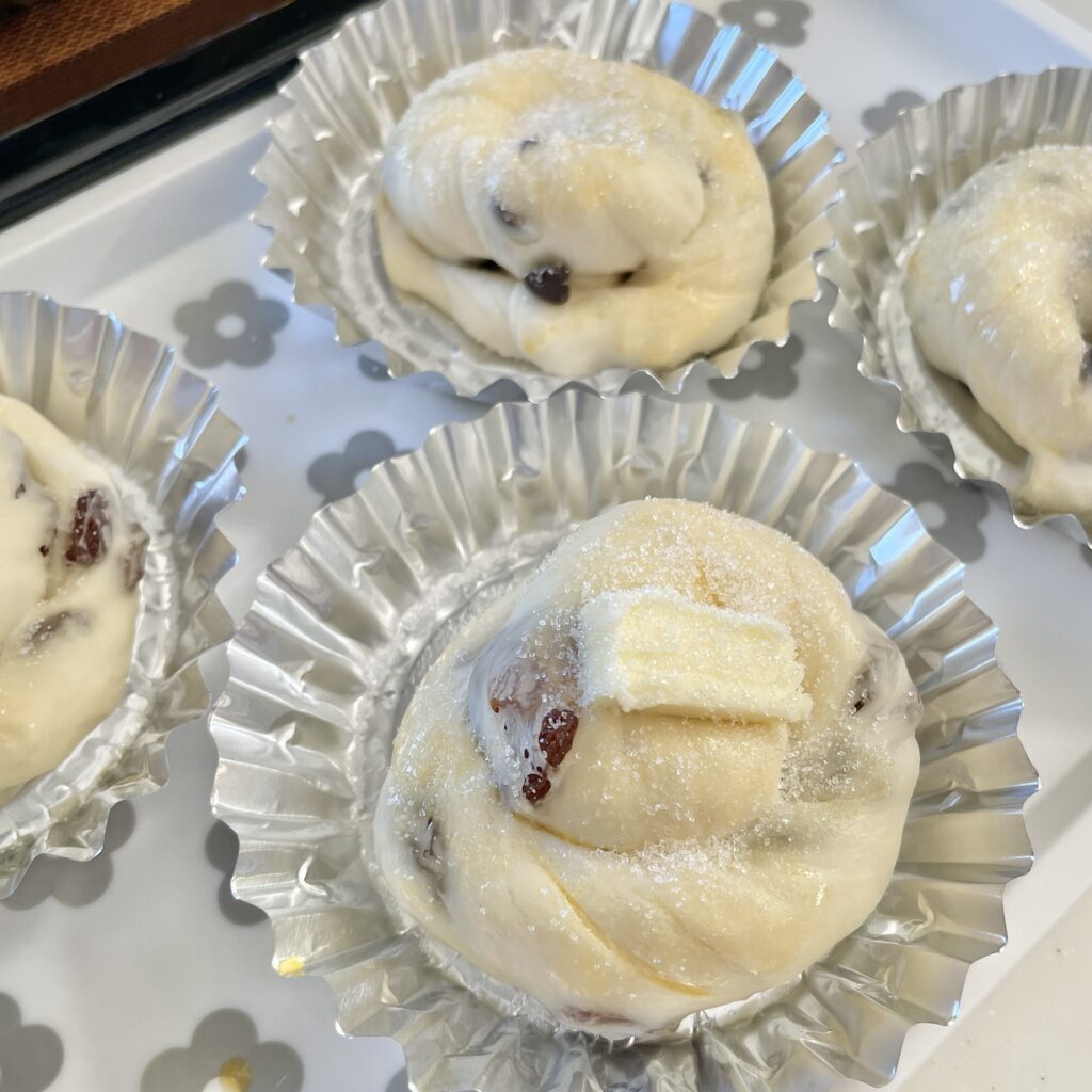 チョコ、レーズンには、グラニュー糖を振って、レーズンの方にはさらにバターを1カケ🧈