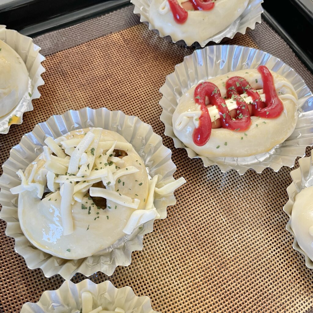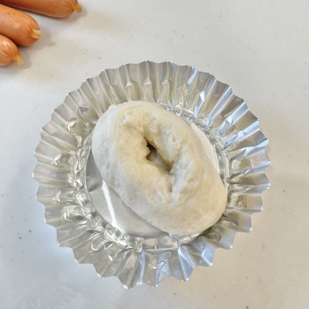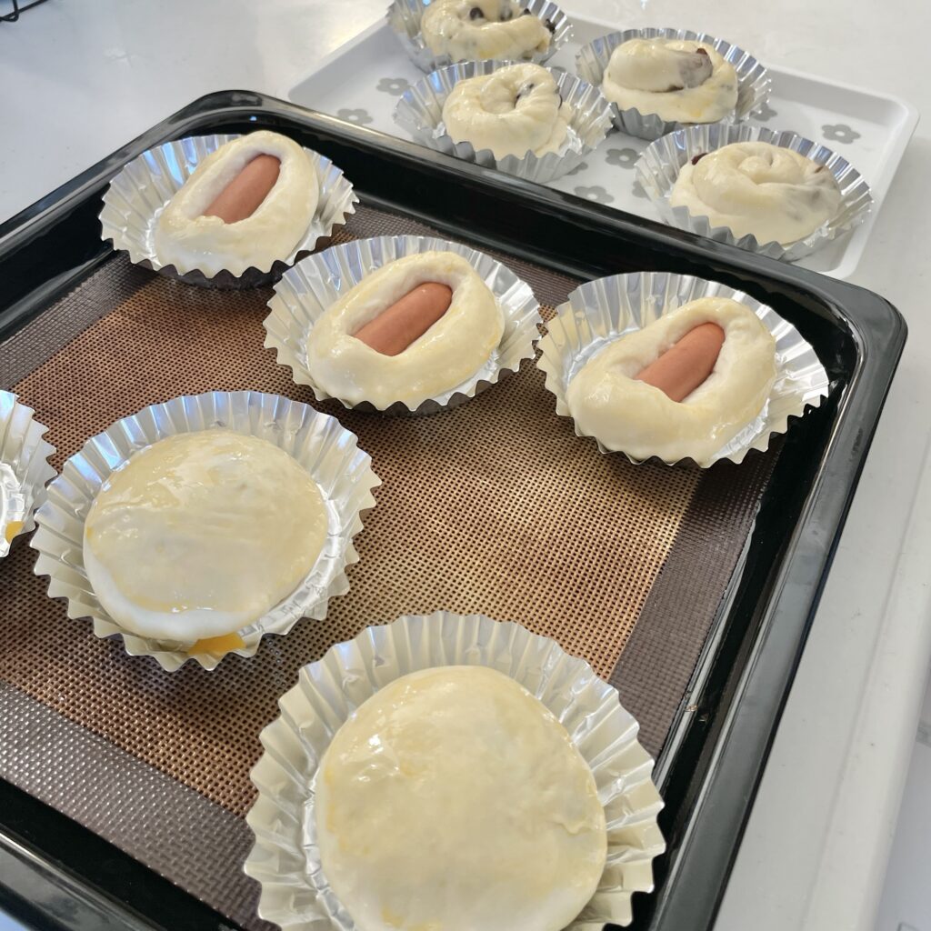生地に穴を開けて、そこにウインナーをはめ込む。丸いままの生地にウインナーを埋め込むと、焼き上がった時に膨らんで『パンの上にウインナーが乗ってる』状態になる🫢