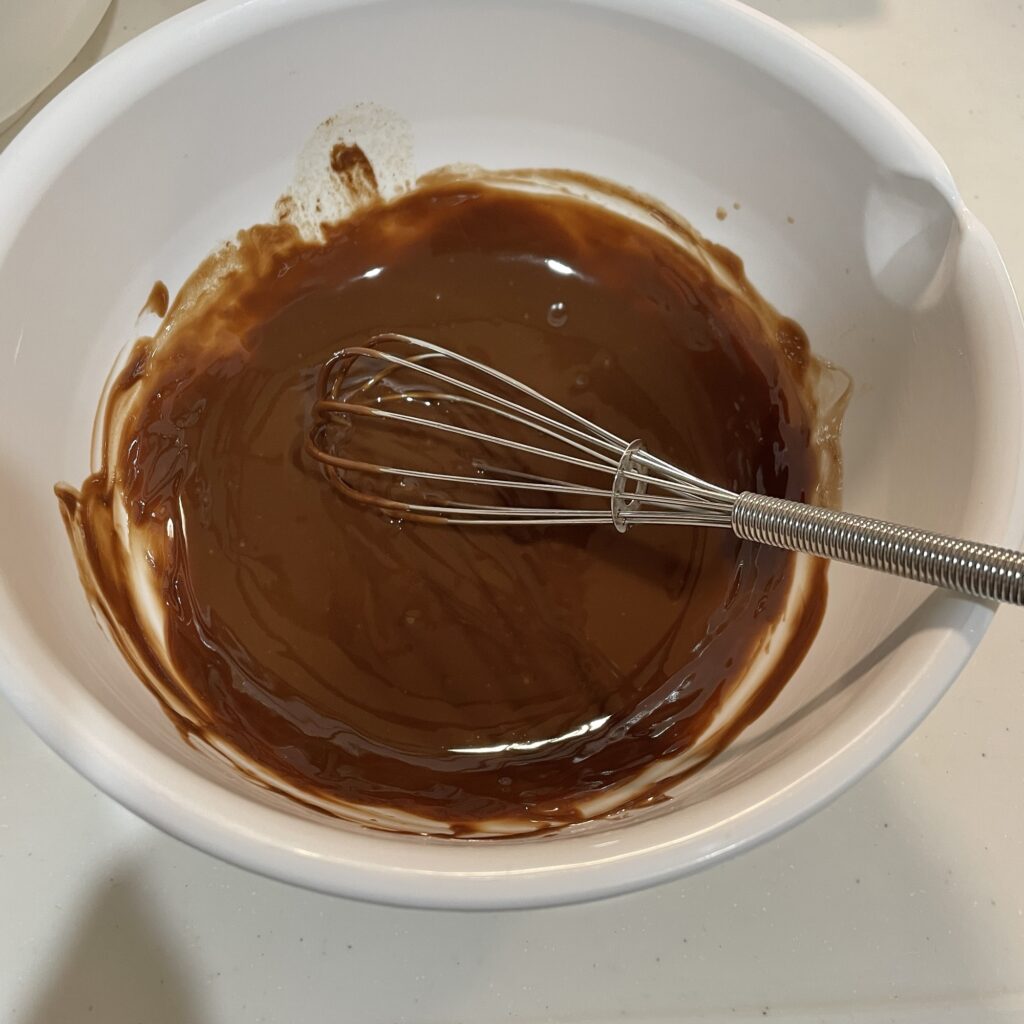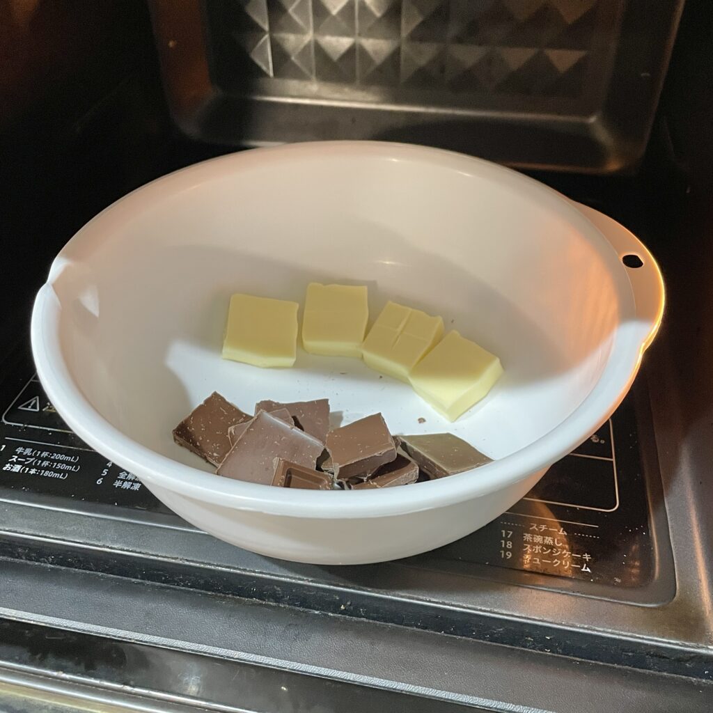②バターとチョコを入れたボウルを600wで40秒加熱して、混ぜる。