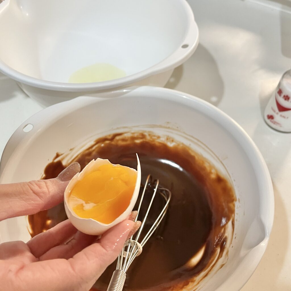 ③チョコ液に卵黄を入れて、よく混ぜる。