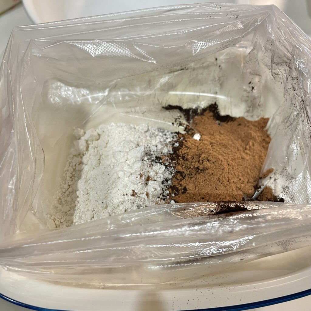 ④袋に入れておいた粉類をシェイクして、チョコ液に入れて、さらに混ぜる。