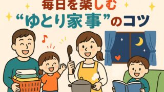 👨👩👧👦 暮らし×家族時間 【時間がない人向け】平日夜をラクにする“ゆとり家事”のコツ 平日の夜がバタバタで「家族との時間がない…」と感じるパパママへ。この記事では、毎日の家事を少しラクにする“ゆとり家事”のコツを紹介します。心と時間にゆとりをつくって、家族との笑顔を増やしましょう🍳✨ 2025.10.21 👨👩👧👦 暮らし×家族時間